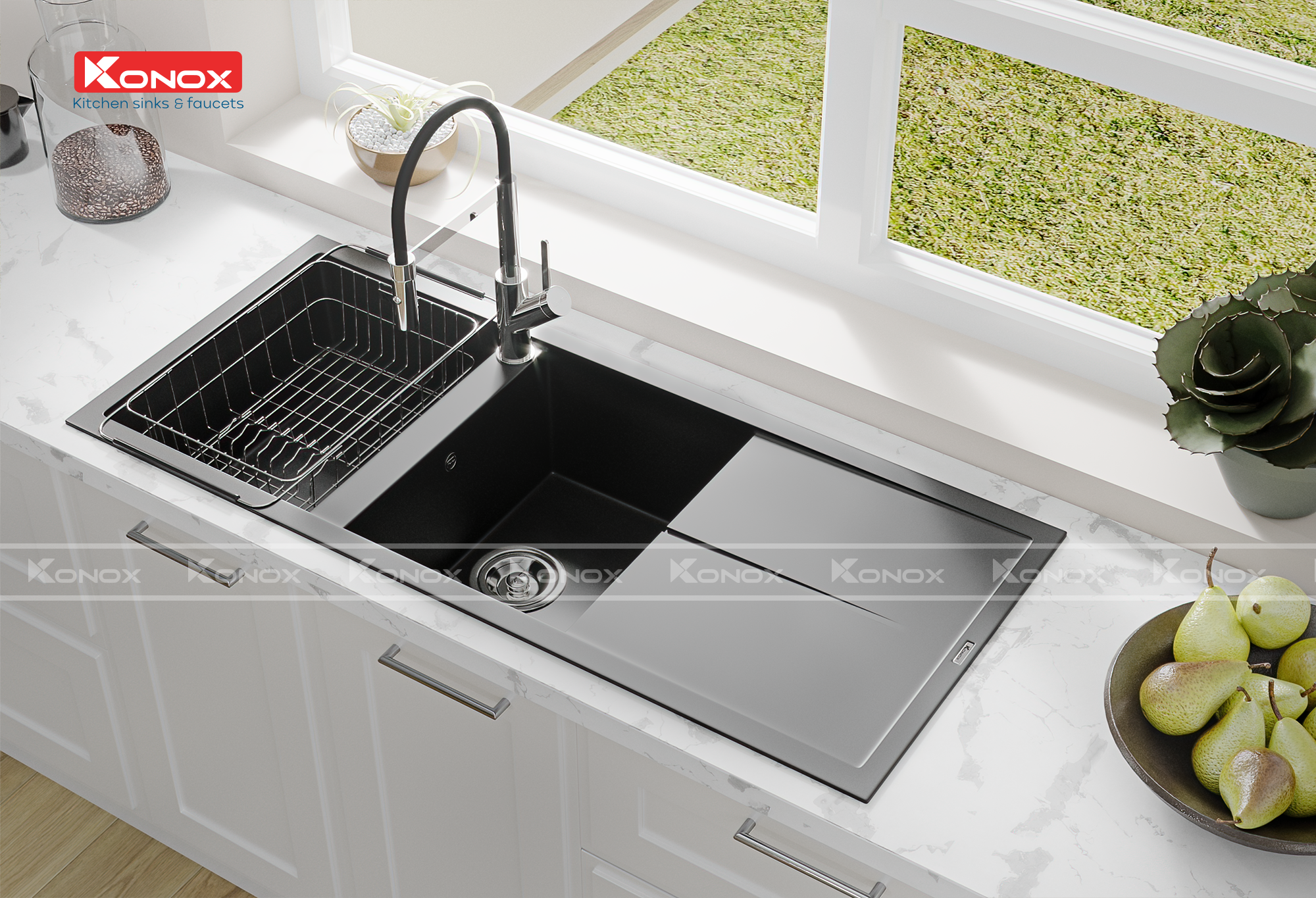 Chất liệu: Đá Granite Thiết kế 2 đường nước nóng – lạnh Đầu vòi rửa có thể kéo dài Đầu vòi tạo bọt, hạn chế bắn nước khi sử dụng Bảo hành 5 năm