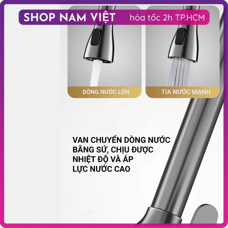 ️ Tính năng Vòi rửa chén bằng thép không rỉ bền chắc, an toàn cho sức khỏe. Đầu vòi có thể kéo dài 80cm và có nút điều chỉnh 3 chế độ nước. Thân vòi có thể xoay 360 độ.