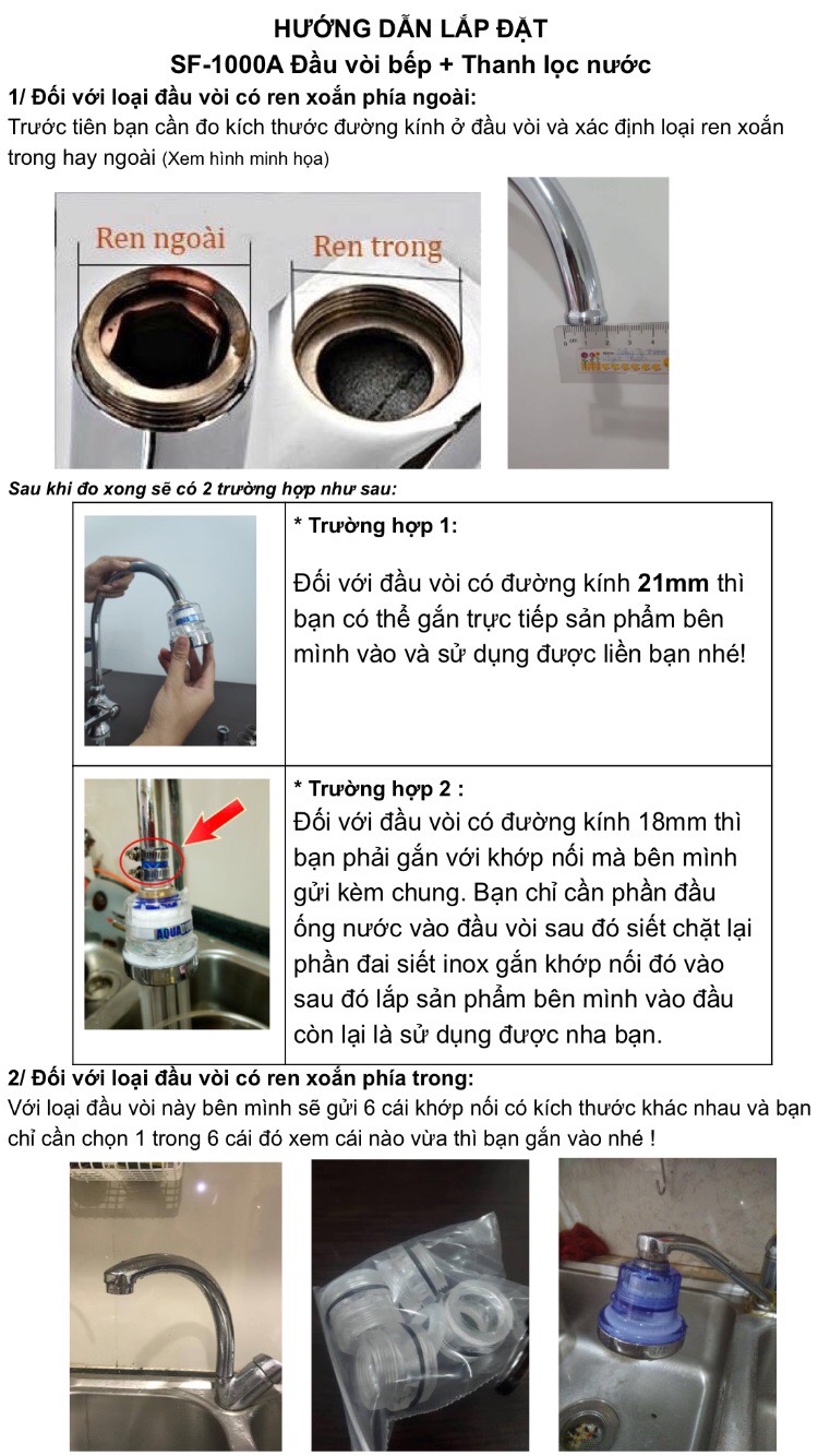 Hướng dẫn lắp đặt : Trước khi lắp đặt, bạn cần xác định loại vòi ở bồn rửa chén của bạn là loại có ren xoắn ở phía ngoài hay ở phía trong và kích thước đường kính của đầu vòi là bao nhiêu ?