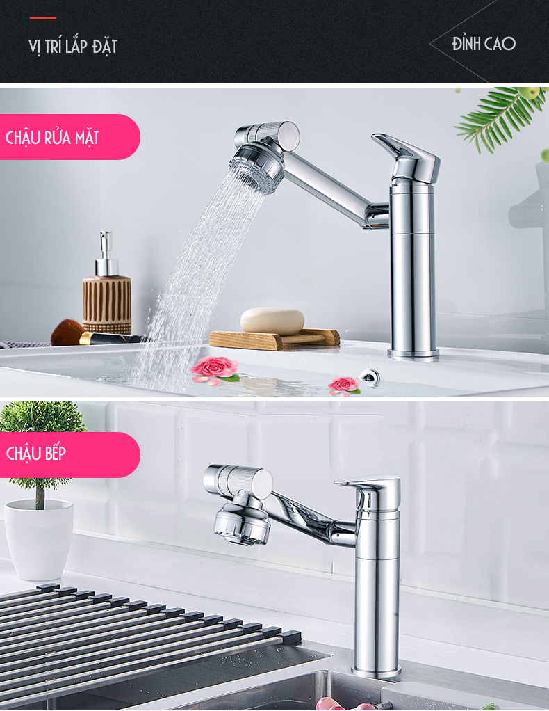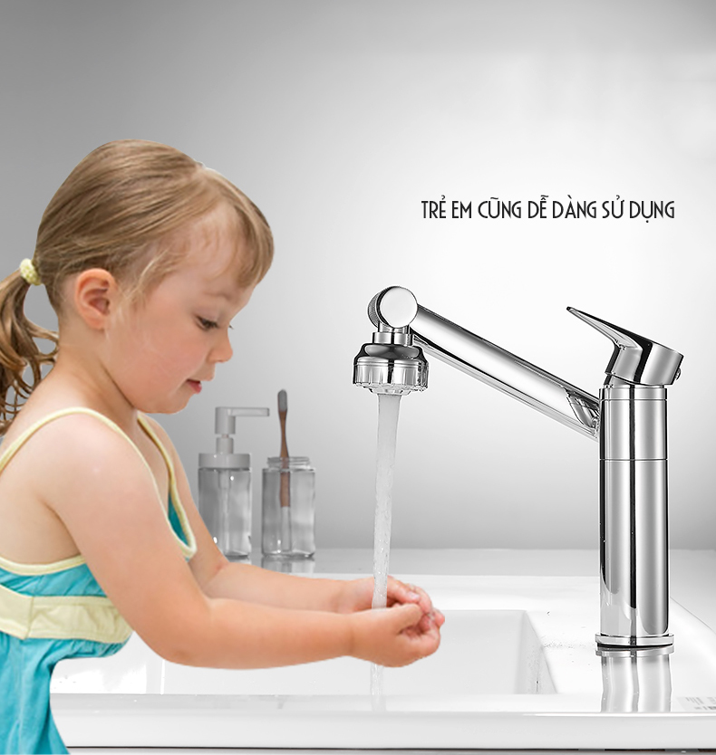 Điểm ưu việt: Thân, đầu vòi đều có thể xoay đa chiều, thân xoay sang trái, phải 720 độ. Cần vòi điều chỉnh lên cao, xuống thấp, điều chỉnh các chế độ phun chùm, phun tia, dòng bằng cách xoáy đầu vòi