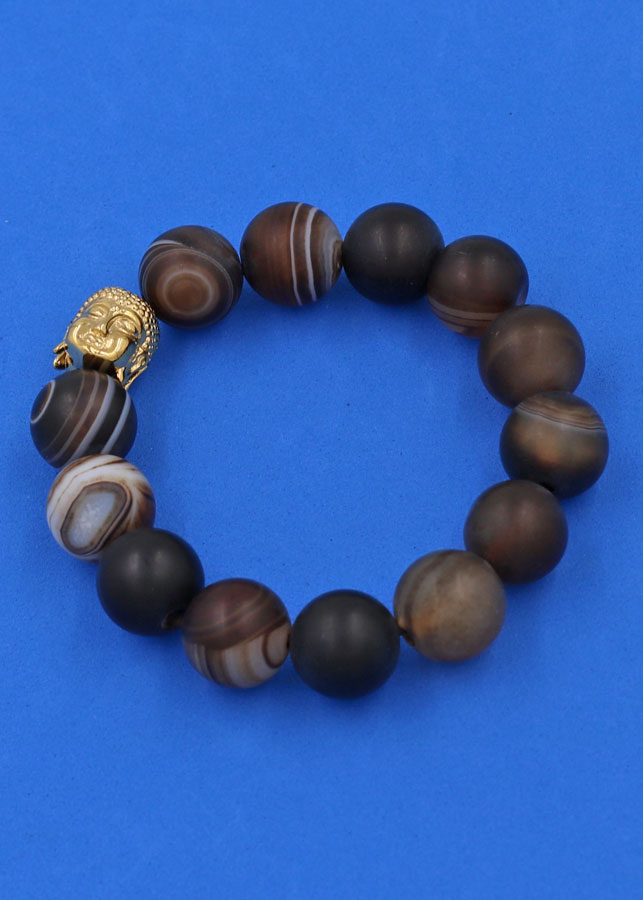 ✨Vòng đeo tay mã não nâu sọc mờ 14 ly cẩn hạt Phật A Di Đà inox vàng VMNNSMNLV14 - hợp mệnh Kim, mệnh Thổ