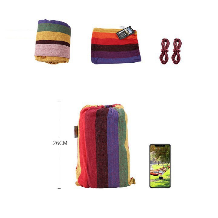 - Võng du lịch được thiết kế dáng cầu vồng, 2 đầu dây chắc chắn cùng dây dù đi kèm.