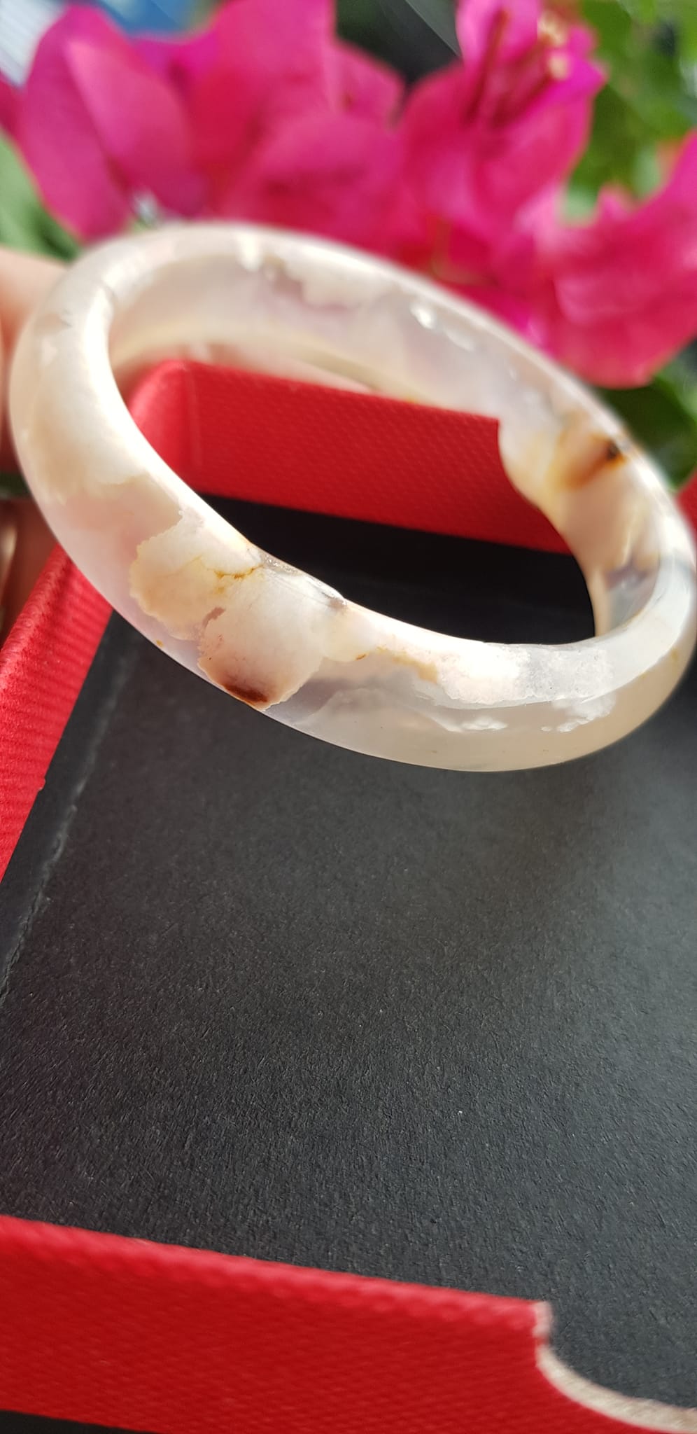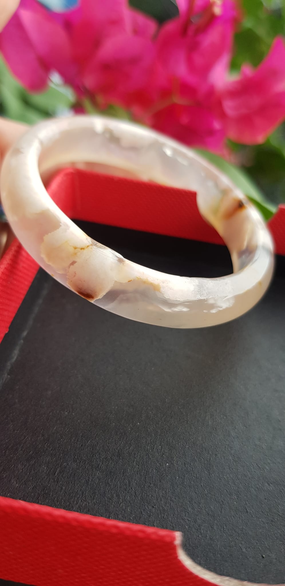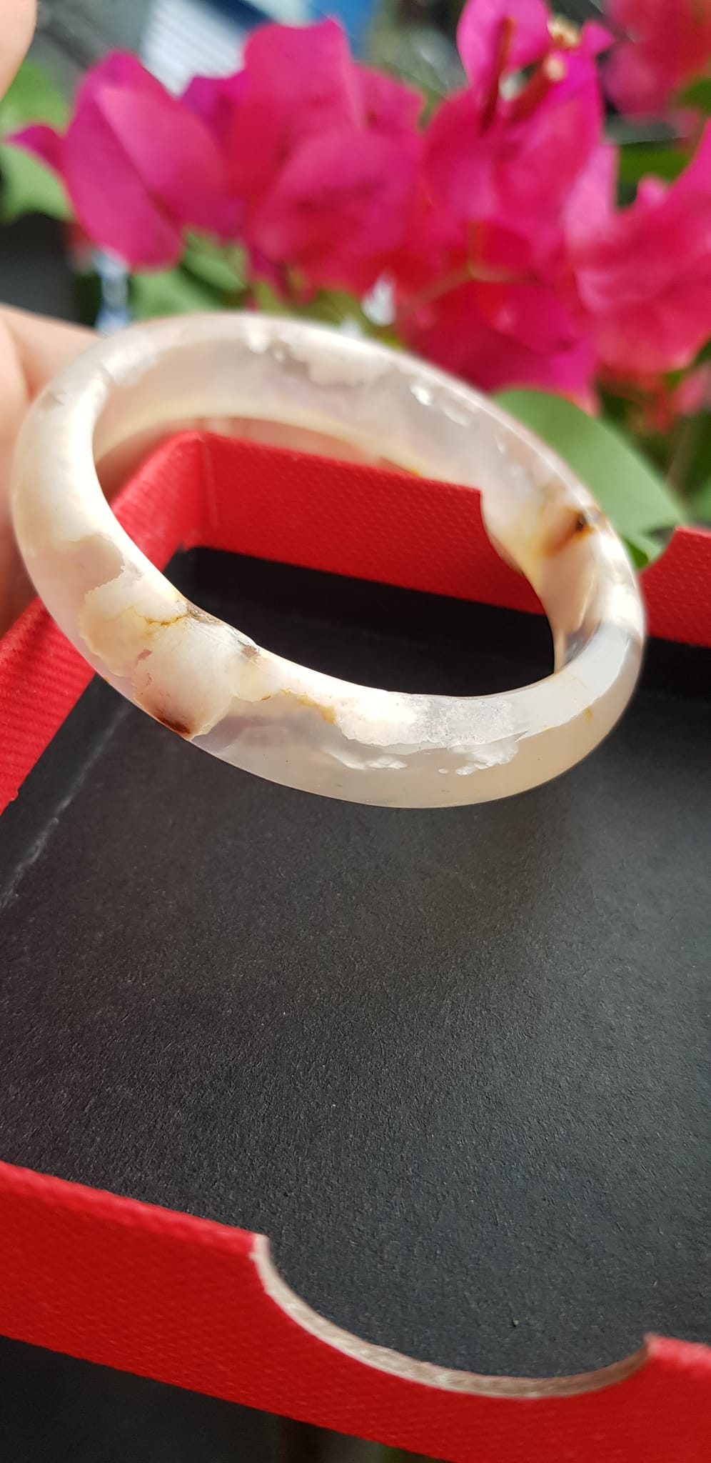 Vòng tay phong thuỷ Nữ Bản Hẹ Đá Mã Não trắng vàng nhẹ bông hoa bóng đẹp Vòng tay Nữ Ni 48mm x Cao 11mm x dầy 6mm Nữ tay nhỏ cân nặng 30kg -