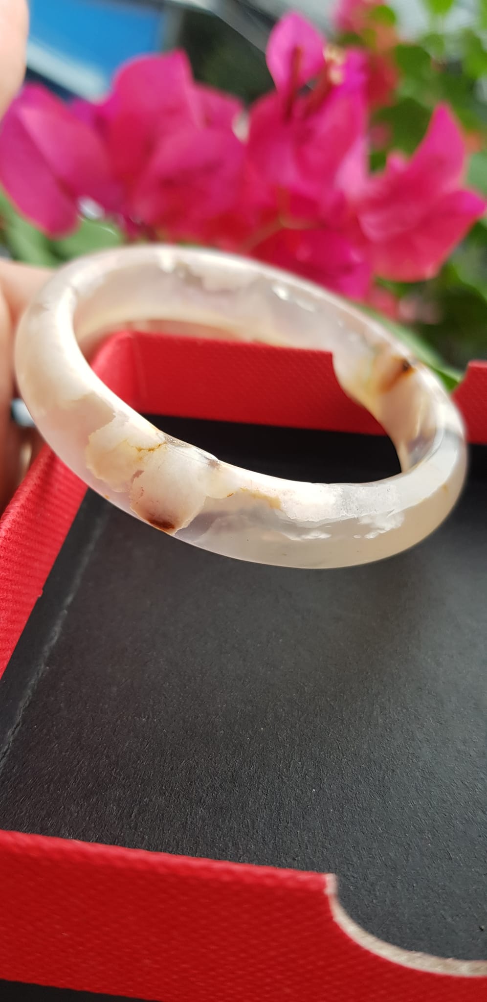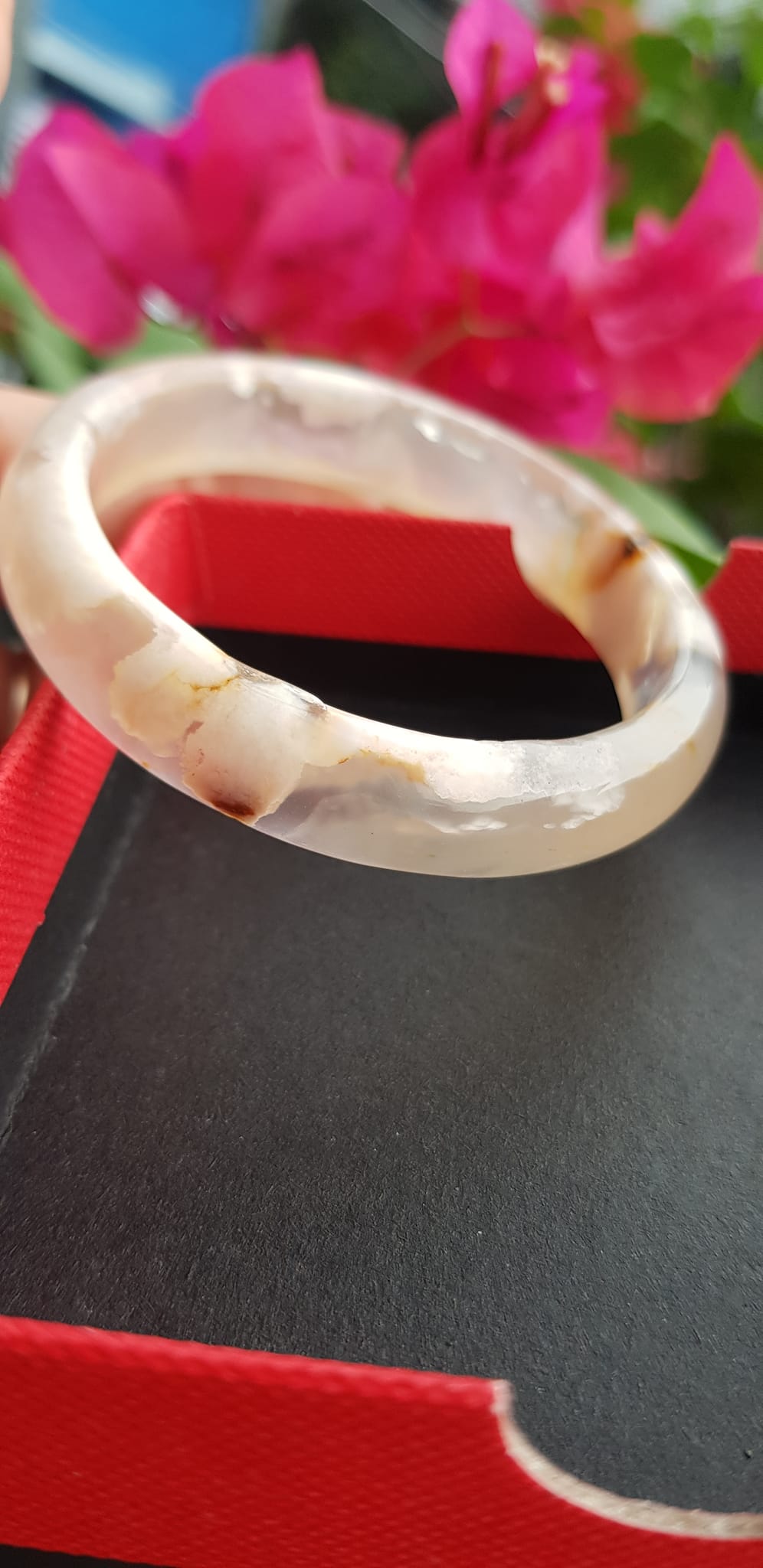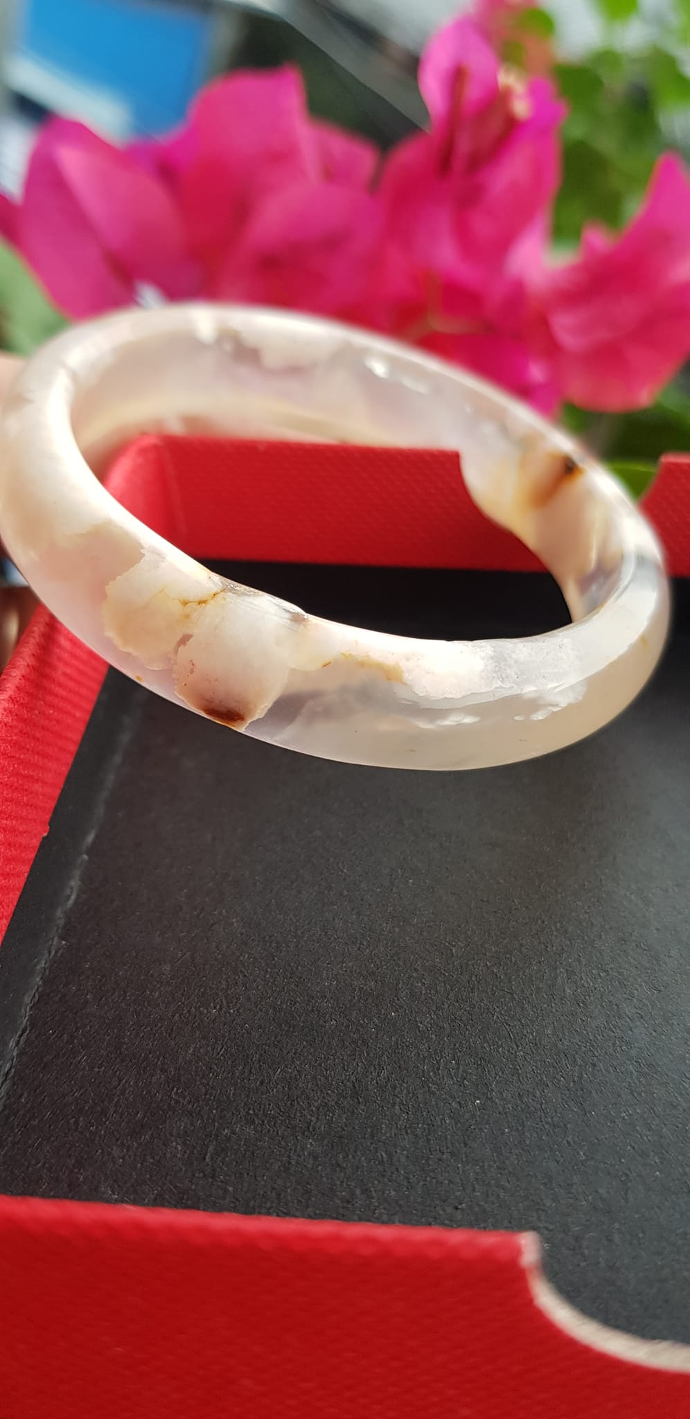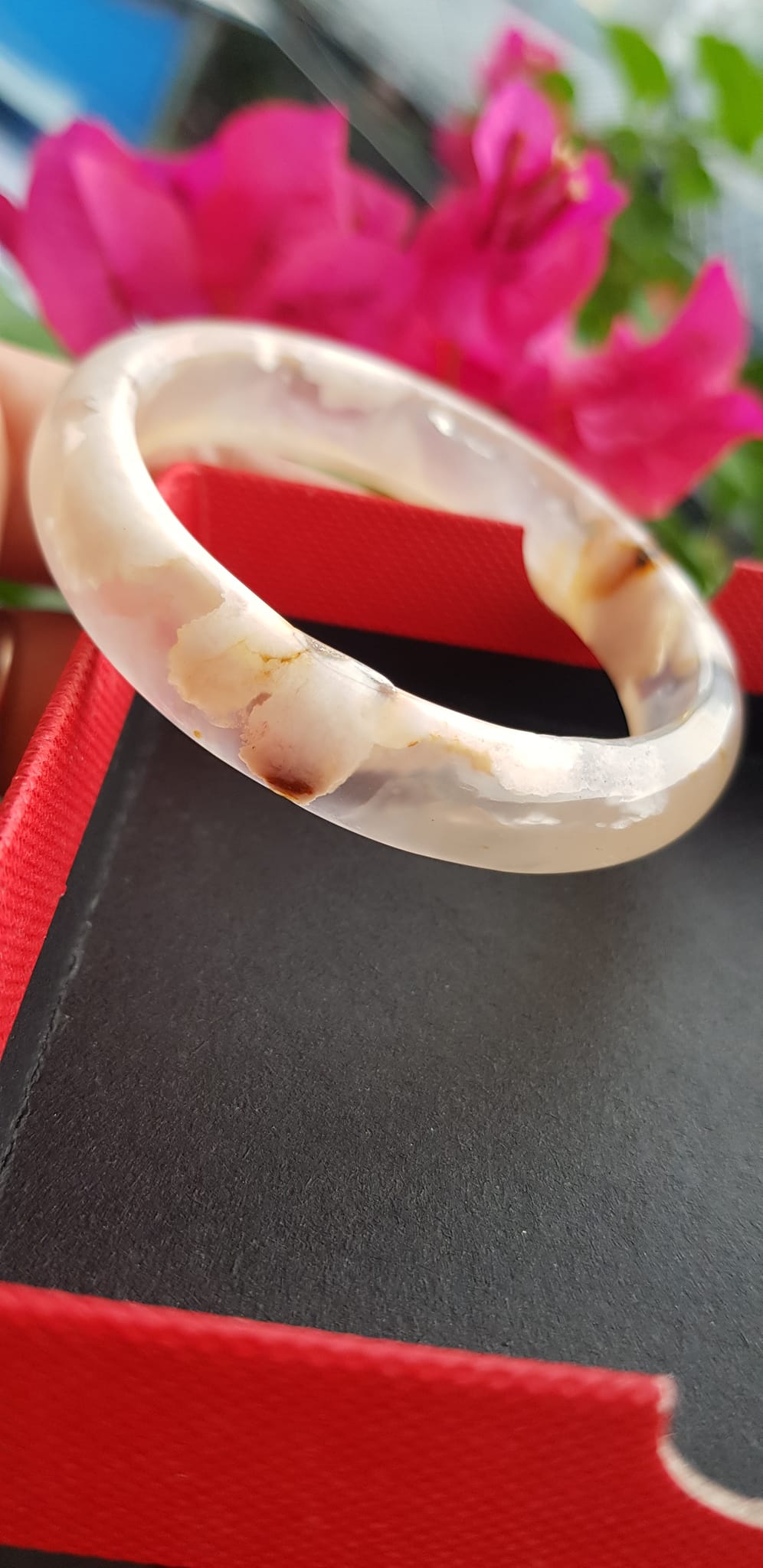 Vòng tay phong thuỷ Nữ Bản Hẹ Đá Mã Não trắng vàng nhẹ bông hoa bóng đẹp Vòng tay Nữ Ni 48mm x Cao 11mm x dầy 6mm Nữ tay nhỏ cân nặng 30kg -