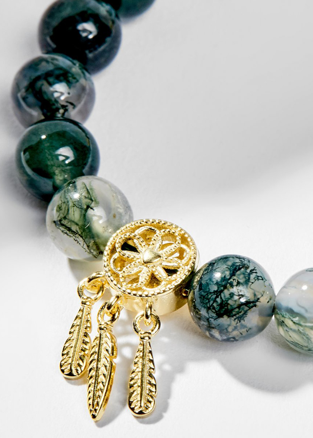 Từ lâu người ta đã biết đến đá băng ngọc thủy tảo giống như một sản phẩm vô cùng tuyệt vời khi kết hợp với thiền định để thanh tẩy tâm hồn. Từ đó giúp đem lại cho người sở hữu tài lộc, may mắn và bình an. Vòng Tay Phong Thủy Nữ Đá Băng Ngọc Thủy Tảo Phối Charm Dream Catcher Mạ Vàng 24K (8mm) Mệnh Mộc, Hỏa được làm từ đá băng ngọc thủy tảo.