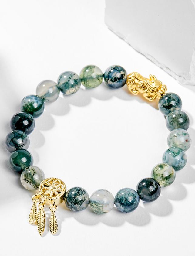 Vòng Tay Phong Thủy Nữ Đá Băng Ngọc Thủy Tảo Phối Charm Dream Catcher Mạ Vàng 24K (8mm) Mệnh Mộc, Hỏa