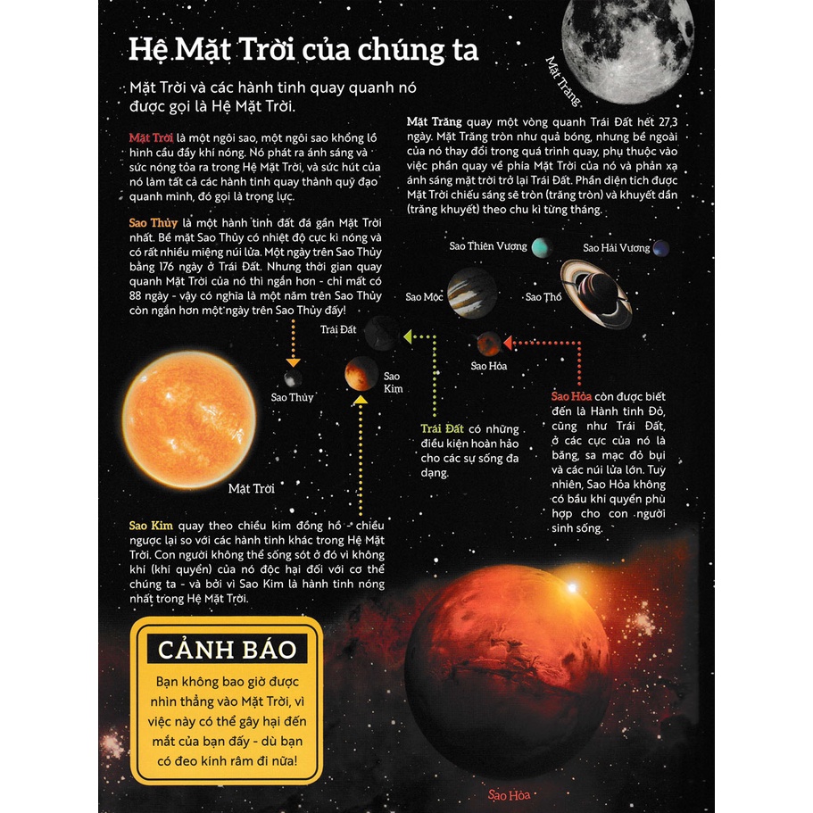 Vũ trụ là một cuốn sách cung cấp những kiến thức khoa học vô cùng bổ ích và lý thú về không gian ngoài Trái đất. Xuyên suốt 12 trang sách, độc giả sẽ được tìm hiểu về các đặc điểm, tính chất của những hành tinh trong Hệ Mặt Trời, dải ngân hà và các chòm sao.