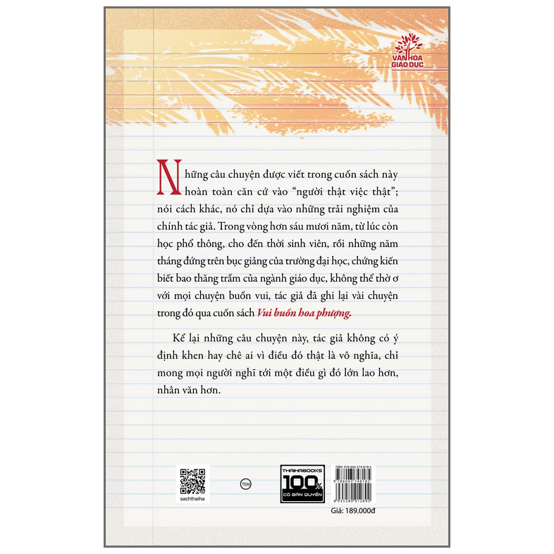Trong vòng hơn sáu mươi năm, từ lúc còn học phổ thông, cho đến thời sinh viên, rồi những năm tháng đứng trên bục giảng của trường đại học, chứng kiến biết bao thăng trầm của ngành giáo dục, không thể thờ ơ với mọi chuyện buồn vui, tác giả đã ghi lại vài chuyện trong đó qua cuốn sách Vui buồn hoa phượng.