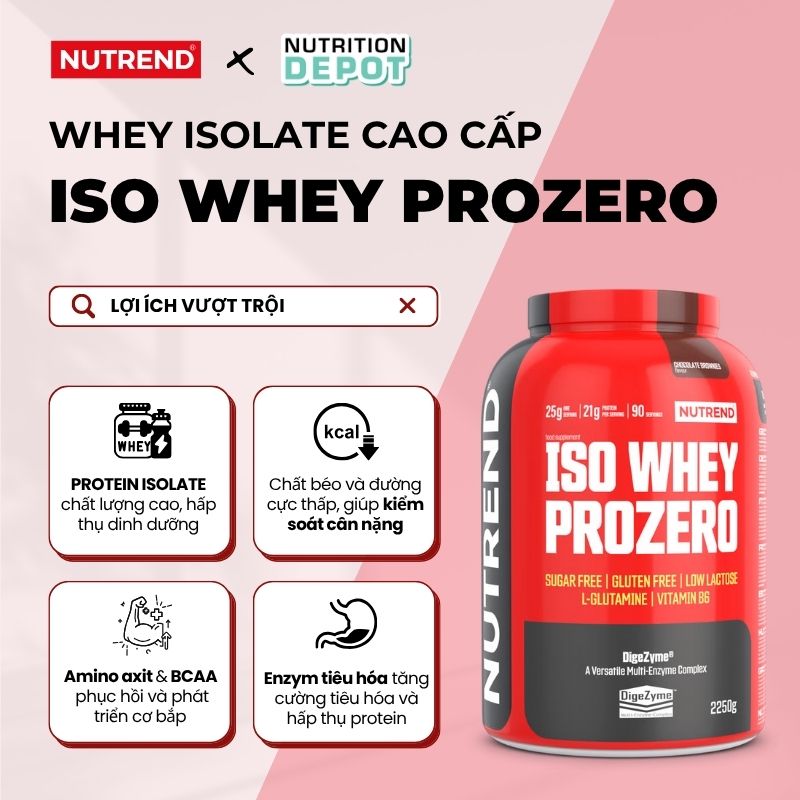 - Nutrend ISO WHEY Prozero với thành phần từ 100% whey Isolate chất lượng cao, không chứa đường, không gluten và rất ít lactose hỗ trợ xây dựng và tăng trưởng cơ bắp tối ưu, phù hợp ngay cả với những người ăn kiêng ít carbohydrate và người có vấn để về lactose trong sữa bò.