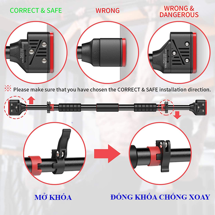 Mô Tả Sản Phẩm: Xà đơn gắn cửa cải tiến có chốt chống xoay (60cm-100cm)(82cm-130cm)(116cm-150cm) (Khách lựa chọn kích thước) Xà đơn có chốt chống xoay: Chiều dài : 62-100cm 82-130cm và 100-150cm Mẫu 62-100cm