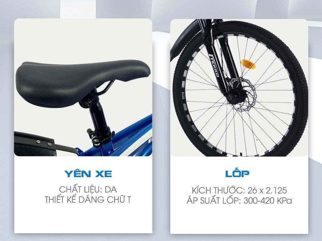 Kích thước bánh xe: 26 INCH Xe được làm bằng hợp kim thép cao cấp làm cho xe rất nhẹ kết hợp với lớp sơn phủ tĩnh điện giúp xe luôn bền màu, hạn chế