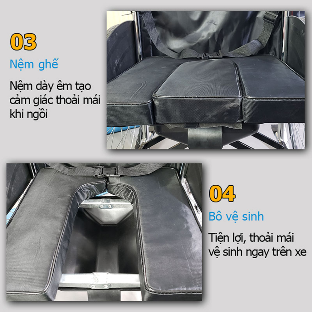 - Là mẫu xe lăn cơ bản không được tích hợp bô vệ sinh hoặc chức năng ngã lưng, nhưng vẫn có đệm ngồi êm ái