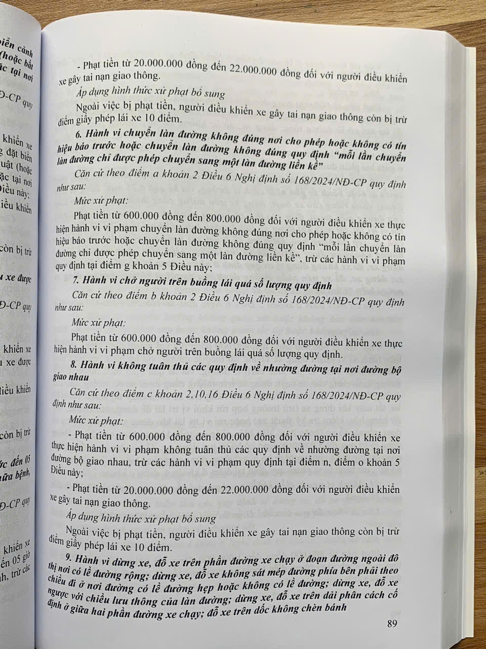 Ngày 26 tháng 12 năm 2024, Chính phủ đã ban hành Nghị định số 168/2024/NĐ-CP của Chính phủ quy định xử phạt vi phạm hành chính về trật tự, an toàn giao thông trong lĩnh vực giao thông đường bộ; trừ điểm, phục hồi điểm giấy phép lái xe. Nghị định quy định xử phạt vi phạm hành chính bao gồm: hành vi vi phạm hành chính; hình thức, mức xử phạt, biện pháp khắc phục hậu quả đối với từng hành vi vi phạm hành chính; mức trừ điểm giấy phép lái xe đối với từng hành vi vi phạm hành chính; trình tự, thủ tục, thẩm quyền trừ điểm, phục hồi điểm giấy phép lái xe để quản lý việc chấp hành pháp luật về trật tự, an toàn giao thông đường bộ của người lái xe. Nhằm tuyên truyền sâu rộng pháp luật về an toàn giao thông, tạo sự chuyển biến mạnh mẽ từ nhận thức đến hành động của người tham gia giao thông Nhà Xuất Bản Hồng Đức xuất bản cuốn sách.