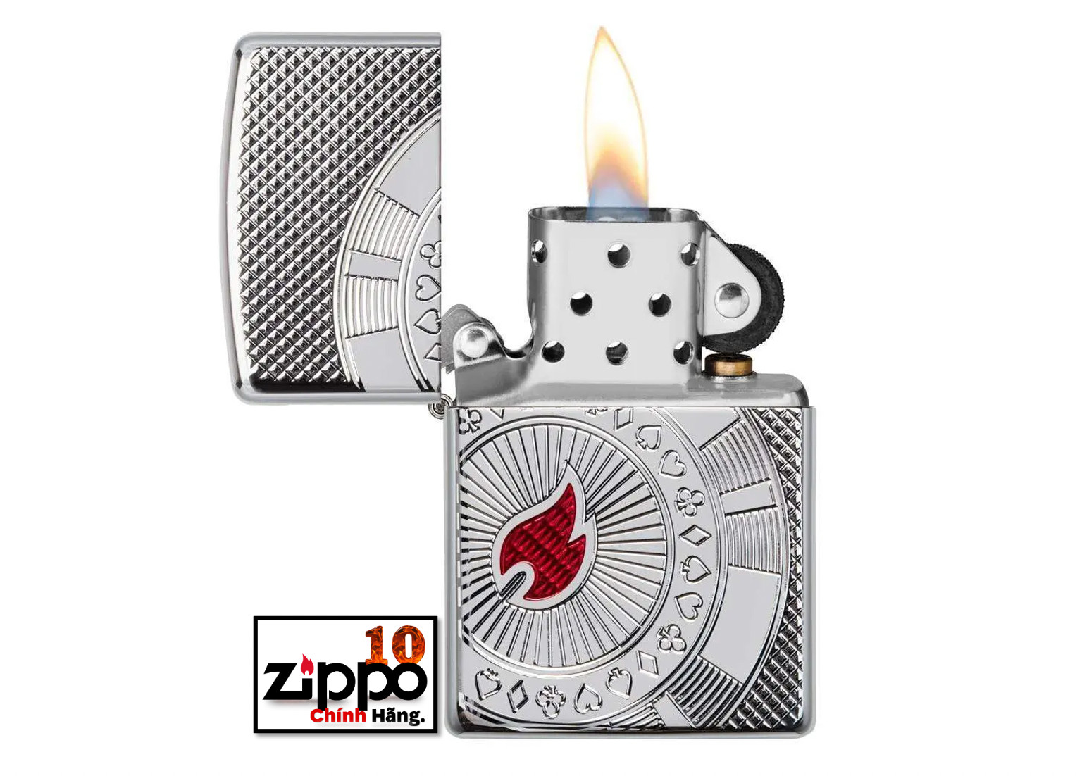 Đây Armor Polish Chrome hiển thị sáng hơn một thiết kế chip poker thanh lịch. Chip poker được tạo ra bằng cách sử dụng quy trình khắc sâu trong khi ngọn lửa Zippo tập trung vào chip mang lại màu đỏ cho thiết kế bằng quy trình inlay epoxy. Được đóng gói trong một hộp đựng dạng quà tặng. Để tối ưu hiệu suất, hãy dùng nhiên liệu bật lửa của Zippo.