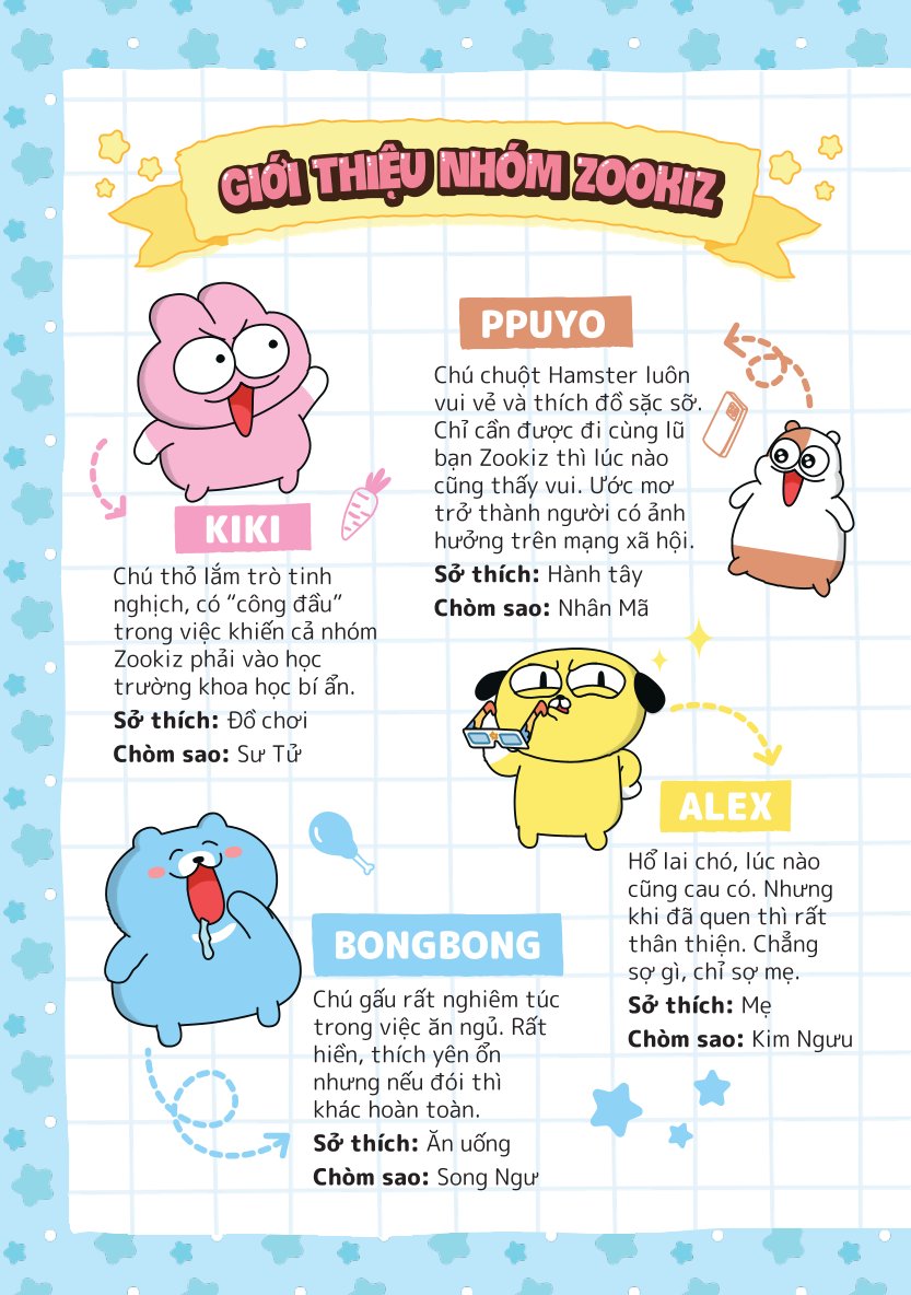 Mua tại TiktokNhóm Zookiz quy tụ những bạn nhỏ tinh nghịch mà đáng yêu: thỏ Kiki láu lỉnh, gấu Bongbong ham ăn, “hổ chó” Alex hay càu nhàu, chuột cảnh Ppuyo ngốc nghếch, lười Nana điệu đà, chó xù Pang ham vui. Theo chân Zookiz, các độc giả nhỏ sẽ bước vào những cuộc phiêu lưu kì thú và hài hước tại trường khoa học bí ẩn đồng thời học thêm nhiều kiến thức bổ ích.